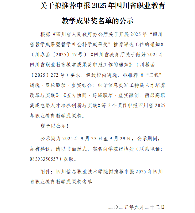 关于拟推荐申报2025年四川省职业教育 教学成果奖名单的公示